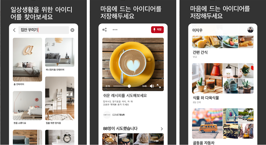 Pinterest 앱을 통해 한눈에 멋진 아이디어를 무료로 발견하고 DIY 영감을 검색할 수 있으며, 세계적으로 2억 명 이상의 사람들이 사용하는 Pinterest는 핀(Pin)과 관심(Interest)의 합성어로 쉬운 요리부터 오늘의 남자와 여자 코디 패션, 다양한 DIY 정보, 인테리어 수납, 예쁜 배경화면 밋 디자인, 웨딩 및 파티 준비 등을 이미지로 쉽게 무료로 검색할 수 있습니다. 정말 쉽고 편리합니다.